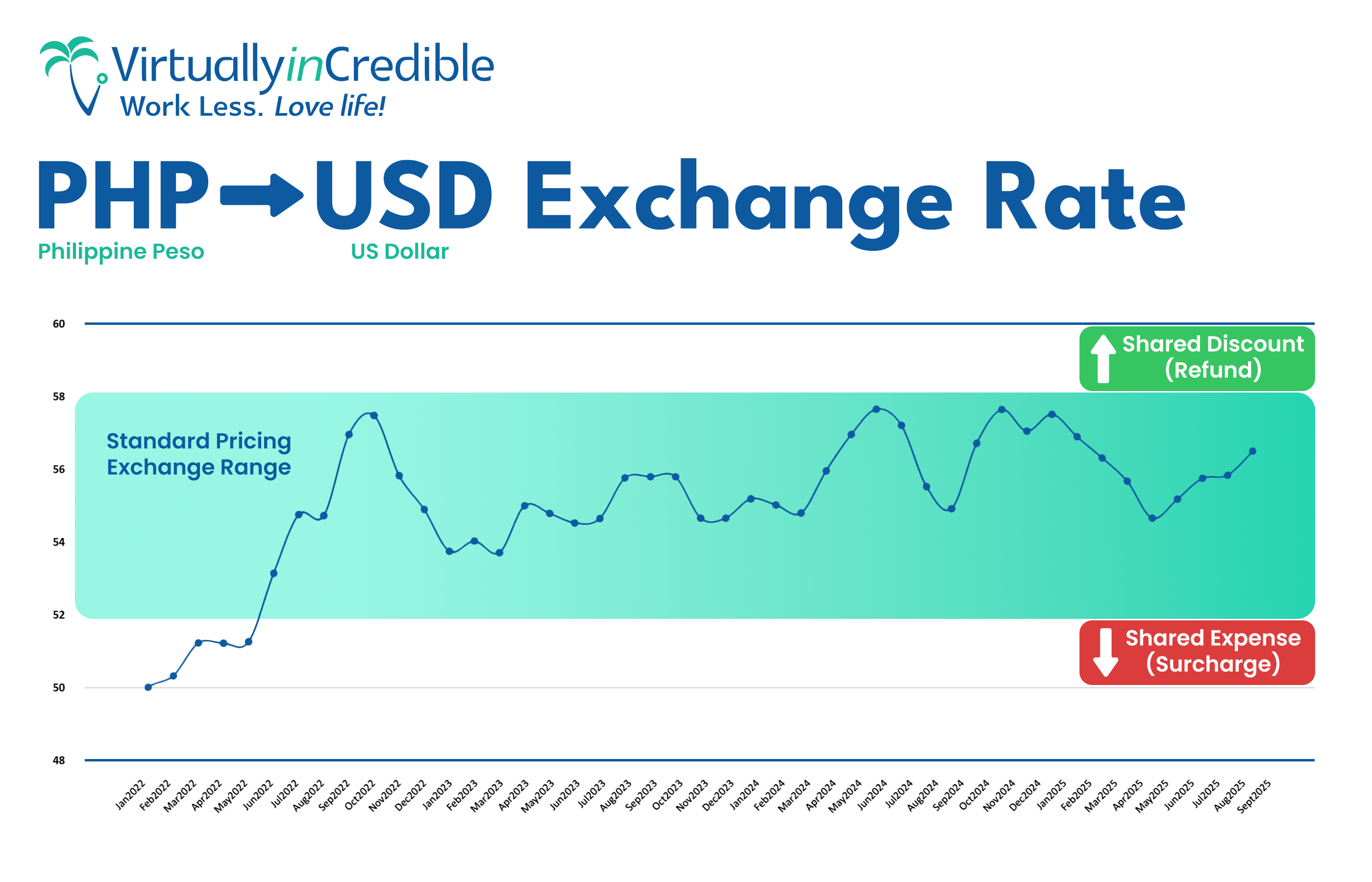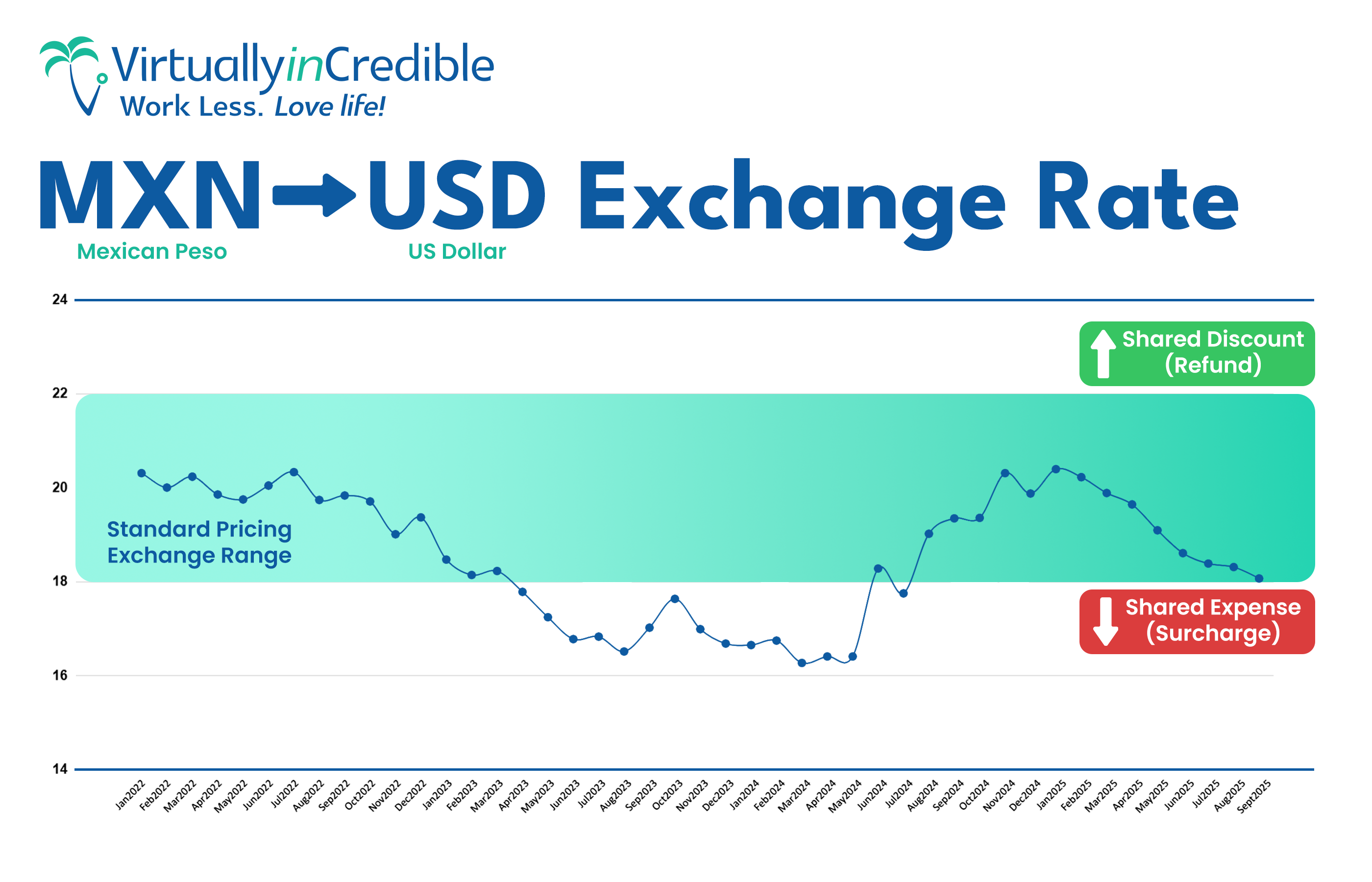 If at any time during the term of this agreement the Base Exchange Rate Range for Services specified in a foreign currency has fluctuated beyond this range, VirtuallyinCredible will calculate a foreign currency exchange adjustment for those Services. The adjustment will be calculated by comparing the Base Exchange Rate with the foreign currency exchange charged by our global payout provider or another comparable service to determine the average exchange rate during the month of service before each invoice is issued. Any resulting decrease in costs will be credited to Client and any resulting increase in costs will be invoiced to Client. In the event VirtuallyinCredible incurs a pass-through cost in a currency other than U.S. Dollars, the Parties shall determine the amount payable based on the relevant conversion rate as reported on OFX.com on the invoice date.